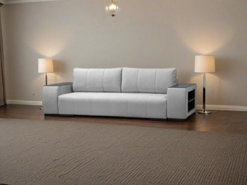 Габаритные размеры: 2650х1030х840 (мм). Высота сидения: 410 (мм). Глубина сидения: 500 (мм). Размер спального места: 2030х1500 (мм). Транспортные габариты: 1,83 (куб.м.) Вес: 159,2 (кг) Механизм трансформации: «Пантограф» Материал обивки: Ткань, искусственная кожа Каркас: Брус хвойных пород, березовая фанера, ДСП. Наполнитель: Березовые латы, геовойлок, листовой ППУ, синтепон. Наполнитель подушек: Дробленый ППУ, синтепух. Бельевой ящик: ЛДСП, ЛДВП, размер: 1880х610х195 (мм) Трех местный диван-кровать повышенной комфортности. Уникальное сочетание повышенного комфорта и мягкости, создающее оптимальные условия для снятия напряжения и усталости Вашего тела. Механизм «Пантограф» - это «шагающий» механизм, который убережет Ваш паркет или ковровое покрытие от следов роликов и опор дивана. В момент раскладки дивана механизм трансформации приподнимается над полом, а затем аккуратно встает на него. Диван находится вплотную к стене, раскладка производится в переднем направлении Вместительный короб для хранения постельных принадлежностей с ламинированным основанием. Наличие ограничительной спинки. Накладки на подлокотниках из МДФ, облицованные пленкой ПВХ. Ниши для хранения вещей из ЛДСП. Комплект приспинных подушек